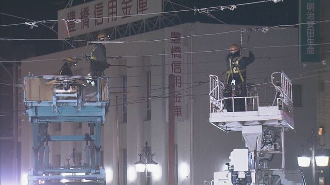 豊橋鉄道によりますと豊橋市の中心部を走る豊橋鉄道市内線は19日午後6時半頃、新川電停付近で架線が切れて垂れ下がり周辺を走っていた車両のパンタグラフが切れた架線に触れました。
