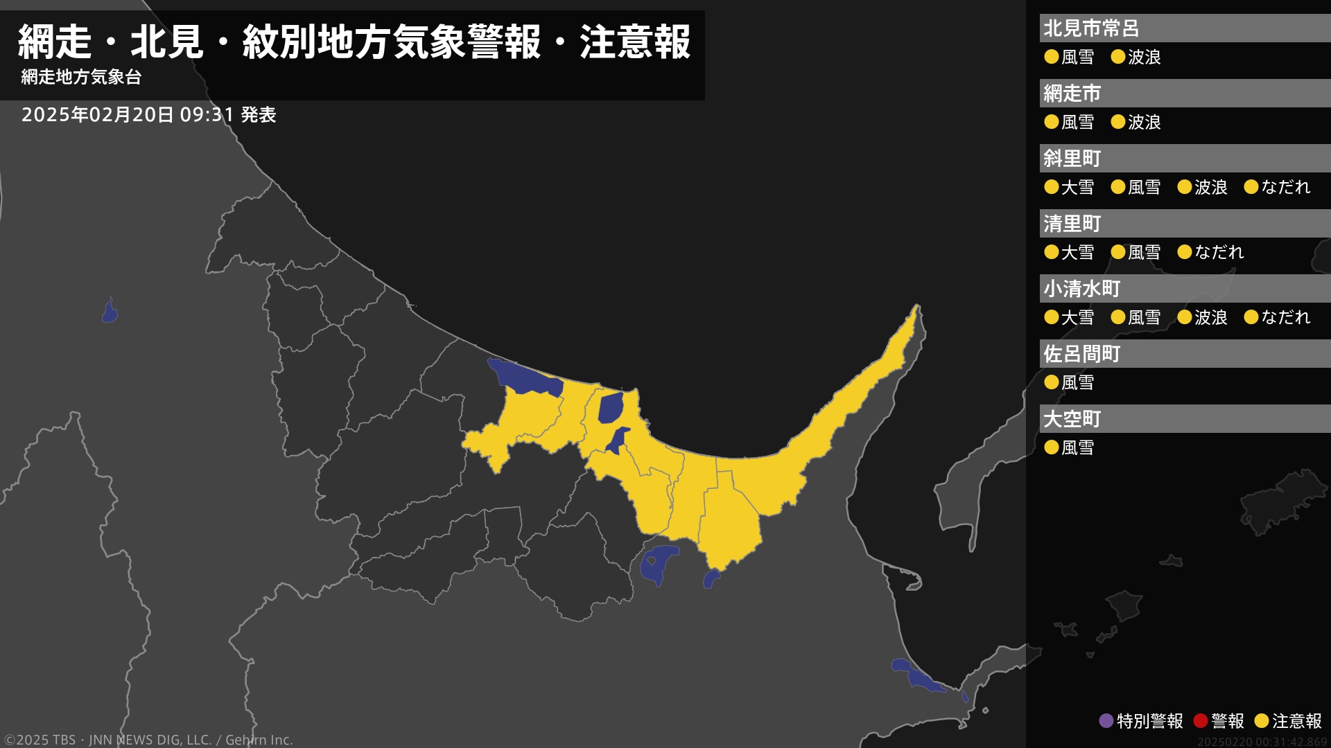 気象台は、午前9時31分に、なだれ注意報を斜里町、清里町、小清水町に発表しました。