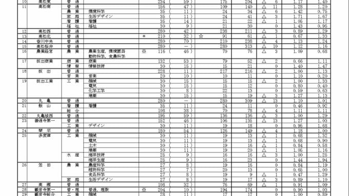 高松南(家庭・生活デザイン)で1.71倍、高松工芸(工業・デザイン)で1.47倍、高松商業(外国語・英語実務)で1.45倍と高い倍率となっています。
