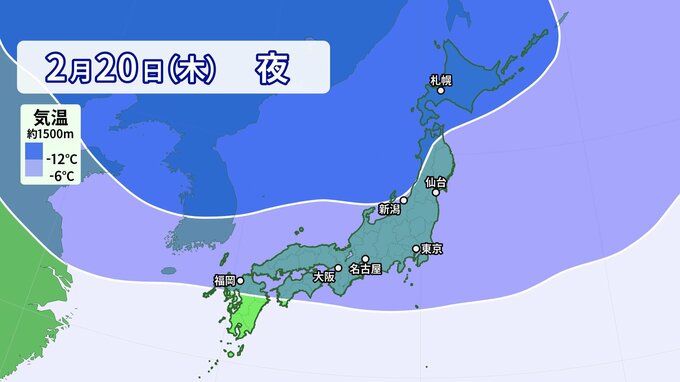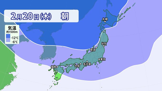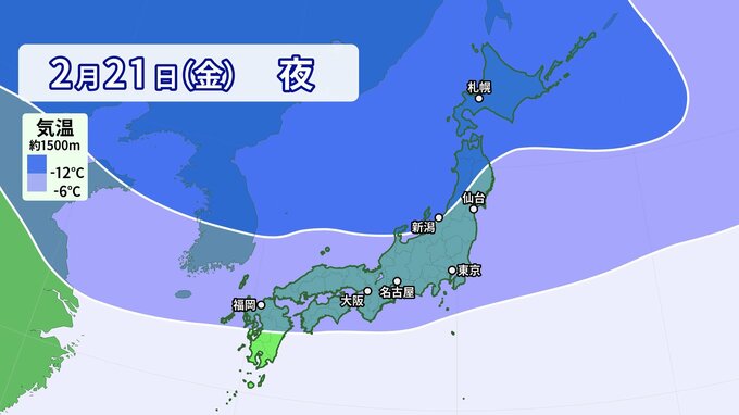 まず寒気の予想です。上空1500m付近で-6℃以下の寒気は、平地でも雪になる目安の寒気で3連休最終日の24日(月)頃まで、日本の上空に居座る予想です。