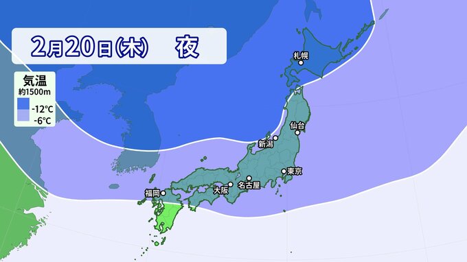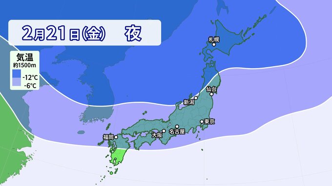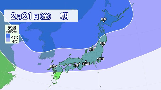 まず寒気の予想です。上空1500m付近で-6℃以下の寒気は、平地でも雪になる目安の寒気で3連休最終日の24日(月)頃まで、日本の上空に居座る予想です。