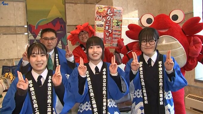 3月2日に行われる宮古毛ガニまつりをPRしようと、20日キャラバン隊がIBCを訪れました。