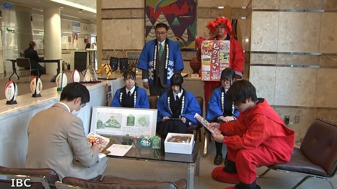 IBCを訪れたのは、青いはっぴ姿の宮古商工高校の生徒らキャラバン隊6人です。
