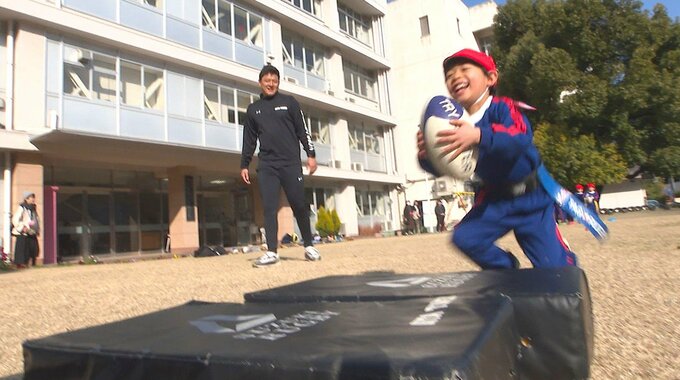大分市の幼稚園でラグビー体験教室が開かれ、高校のコーチに教えてもらいながら子どもたちが元気いっぱいにトライを決めました。