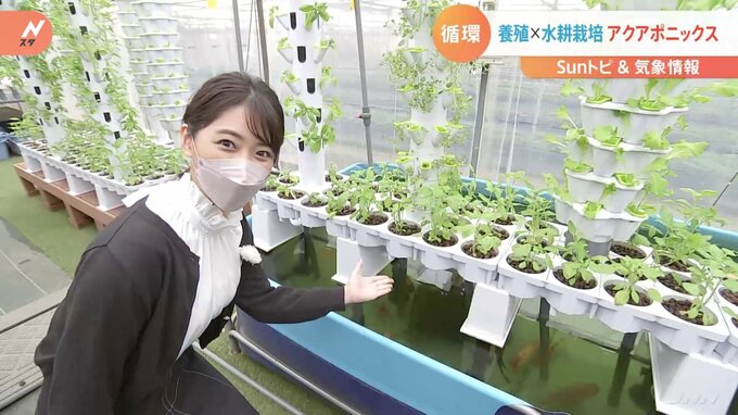 今回は、魚の力を使って野菜を育てる“おさかな畑”をご紹介します。高安奈緖子 気象予報士「見てください、上にはリーフレタスやバジル、下には鯉などの魚がいます」こちらは、養殖の“アクアカルチャー”と水耕…