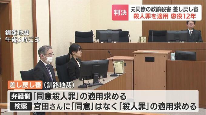 釧路地裁で行われた1審では、「同意殺人罪」が適用され懲役6年6か月の判決が言い渡されましたが、控訴審で札幌高裁は「1審判決は宮田さんの心理状態などを総合的に検討する視点を欠いていて不合理」として審理を釧路地裁に差し戻していました。