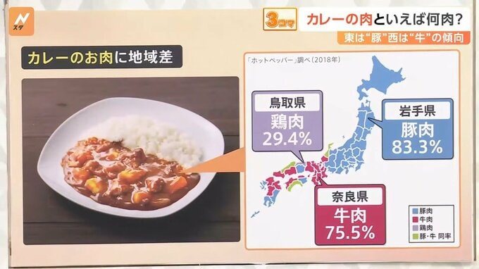 カレーのお肉も地域によって差があり、ホットペッパーの調査によると、岩手県では豚肉が83.3%、奈良県では牛肉が75.5%、鳥取県では29.4%という結果だということです。