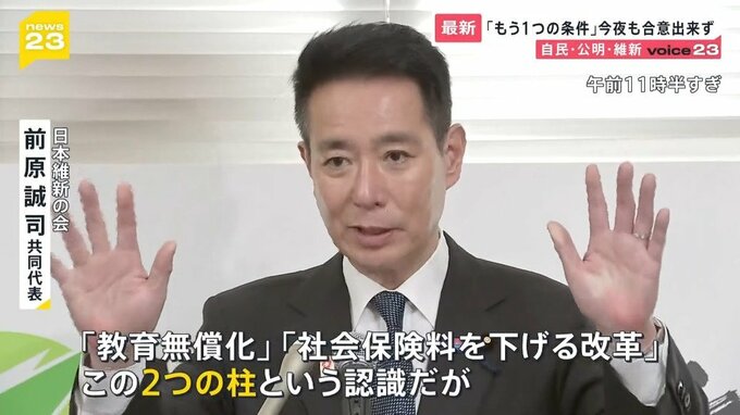 維新側は高校無償化に加え、社会保険料について国民ひとりあたり6万円、総額4兆円の負担軽減に取り組むことなどを、合意文書に盛り込むよう求めているのです。