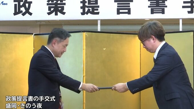 20日は盛岡商工会議所青年部の鹿糠幸康会長から内舘茂市長に提言書が手渡されました。
