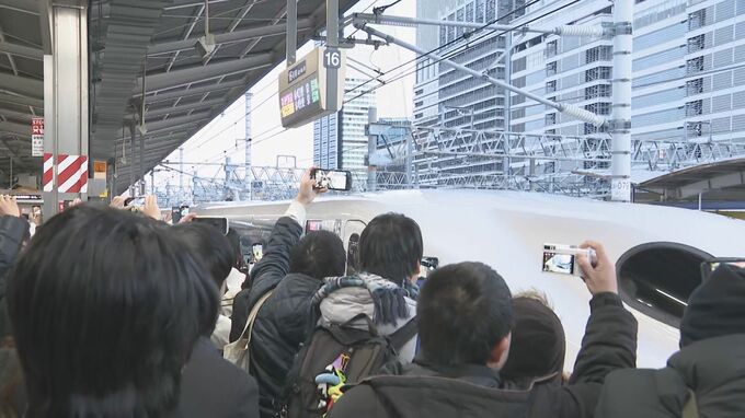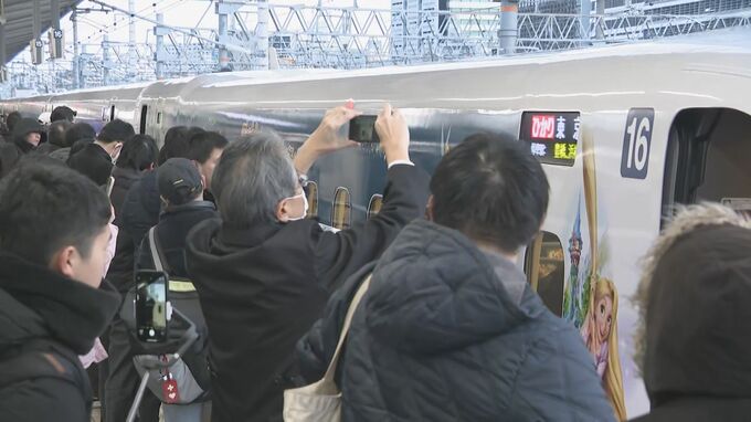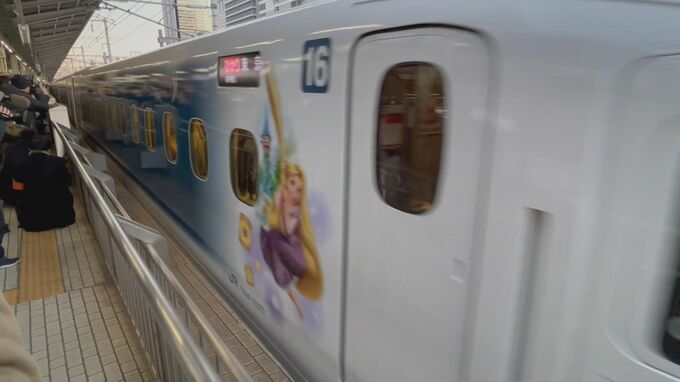 ディズニーの世界が特別塗装された新幹線の運行が始まり、早朝の名古屋駅は多くのディズニーファンらで賑わいました。