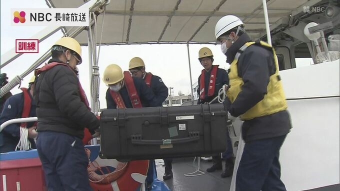 21日に長崎海上保安部の基地で行われた訓練は、長崎県内の離島の観測機器が災害で故障したとの想定で行われ、双方の職員あわせて20人が参加し、気象観測装置を巡視艇に積み込みました。