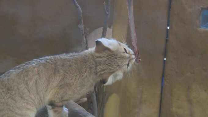 名護市のネオパークオキナワで飼育されているスナネコが誕生日を迎え、大好物の鹿の骨肉がプレゼントされました。