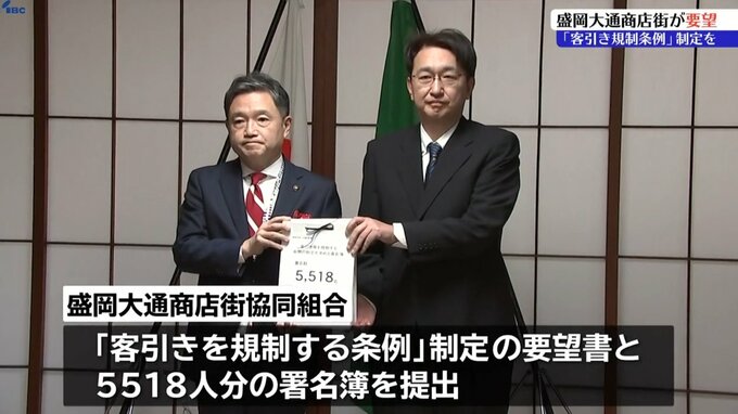盛岡大通商店街での悪質な客引き行為を規制してほしいと、21日商店街の関係者が盛岡市の内舘茂市長に条例制定を求める要望書などを手渡しました。