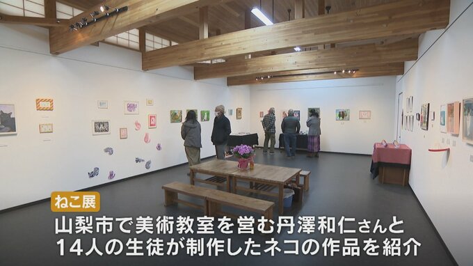 この作品展は山梨市で美術教室を営む丹澤和仁さんと14人の生徒が制作したネコにモチーフにした作品を紹介するものです。
