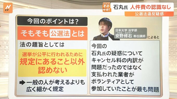 日本大学法学部の安野修右専任講師によると「今回の石丸氏の疑惑について、キャンセル料の内訳が問題だったのではなく、支払われた業者がボランティアとして参加していたことが最も問題」との指摘です。