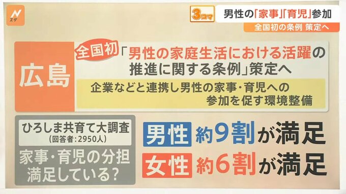 広島県は全国で初となる「男性の家庭生活における活躍の推進に関する条例」を策定する方針を明らかにしました。企業などと連携し、男性の家事・育児への参加を促す環境整備を整えるのが狙いで、2025年度中に条例案を策定するということです。
