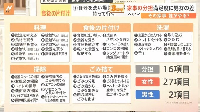 さらに広島県では家事分担についても調査を行いました。(1)料理、(2)食後の片づけ、(3)洗濯、(4)掃除、(5)ごみ捨てと5つの分野に分け、全45項目でどのくらい分担できているか質問しました。