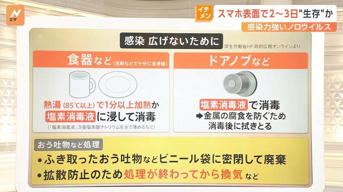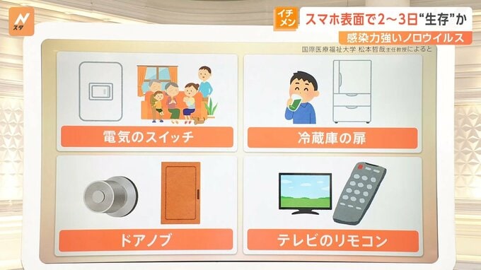 仮に家族が感染した場合は、電気のスイッチや冷蔵庫の扉、テレビのリモコン、ドアノブなどに注意してください。