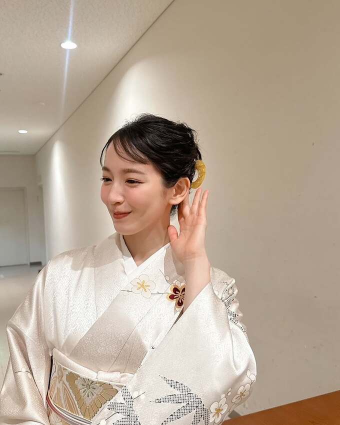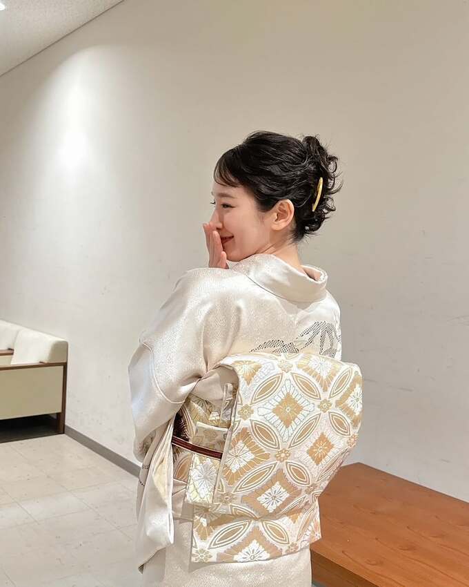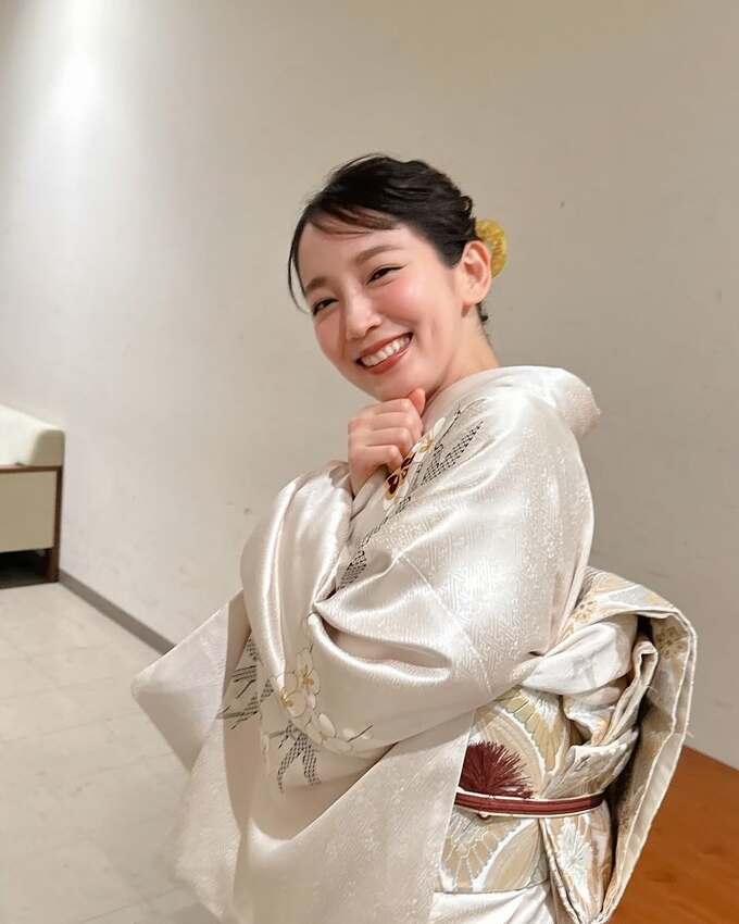 吉岡さんは、白を基調に梅の花と竹の葉をあしらった訪問着に、白地に金で縫われた七宝菱華柄の帯を締め、たおやかにポーズをとり、すこし照れくさそうに微笑んでいます。