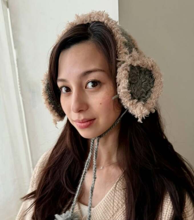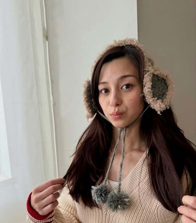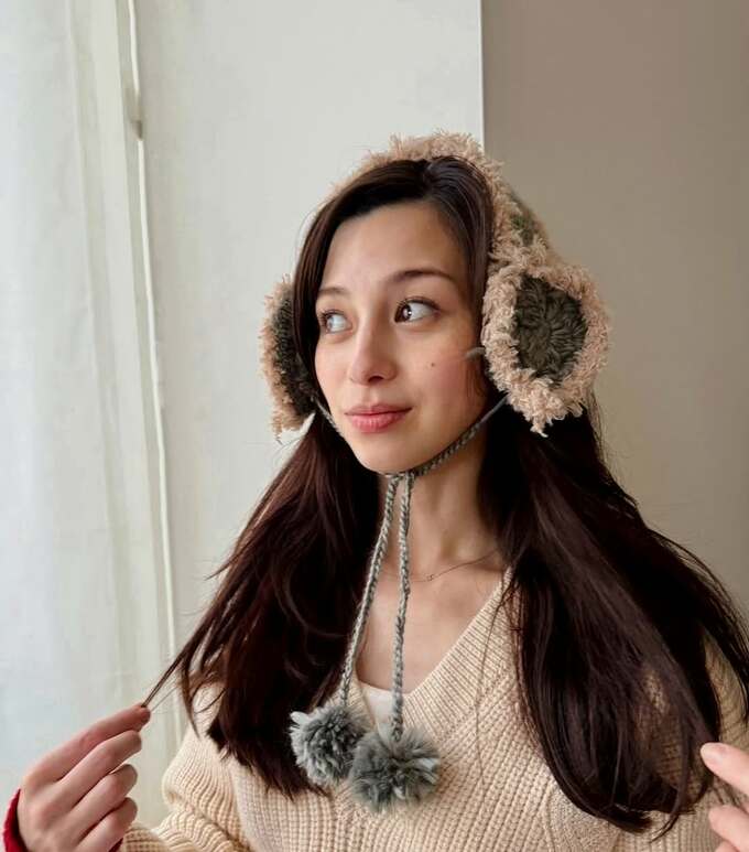 中条さんは、白いカーテンが窓際でにかかる室内で、ざっくりしたベージュのニットを着て、同系色で編まれたイヤーマフをかぶり、自然光の中でリラックスした表情を見せています。