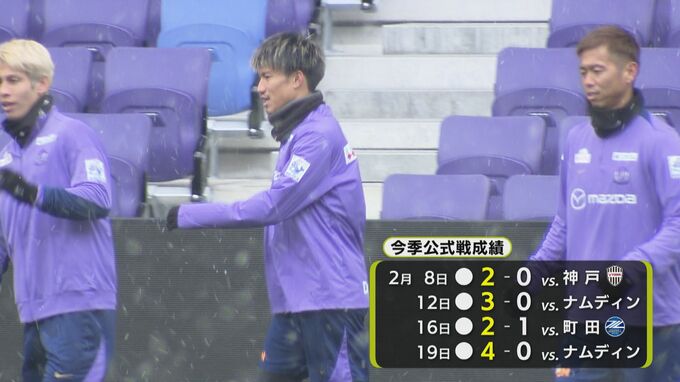 小雪もちらつく寒さの中、23日の地元開幕戦へ向け、トレーニングを行ったサンフレッチェ広島。