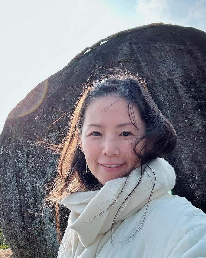 小西さんは「ご縁があって奈良県へ。」「『長寿岩』なる、なんと1億年前!の、マグマが固まって出来た"花こう岩"」とテキストし、岩を背にした写真を投稿。小西さんが「何だかありがたい感じの光が射して」と書いている通り、背後から光が溢れ光輪が現れています。