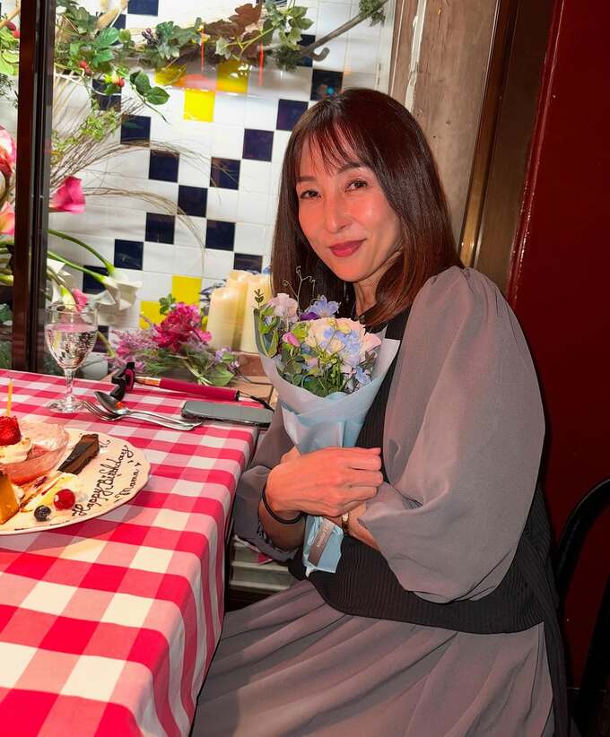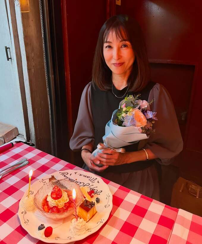 かとうさんは、赤白のギンガムチェックのクロスがテーブルにかけられた、ビストロらしき場所で「Happy Birthday Mama」とチョコで書かれたプレートの上のケーキを前に、花束を贈られてにっこり。