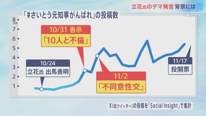 立花氏による元県民局長への中傷が「10人と不倫」「不同意性交をした」と過激になるにつれ、拡散されたことがわかる。