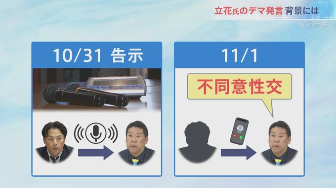 「(11月1日の電話について)連絡が来たんですよ。『立花さん、10年で10人、県庁の職員ばかりですよ』と来たんですよ。どう考えても犯罪でしょって。不同意性交罪とか」