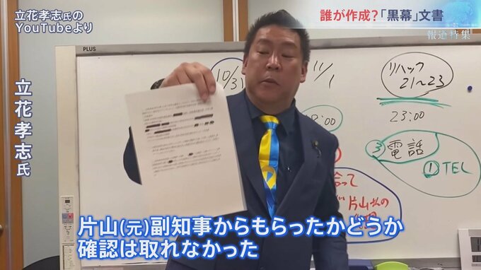 立花氏は、片山元副知事と会うつもりで出かけた。だが、その場に片山氏はおらず、文書は岸口実県議から受け取ったという。