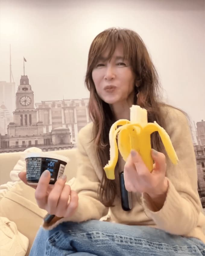 続けて、バナナとヨーグルトを楽しむ様子や、「初の朝一餃子」と、餃子を食べる動画をアップ。