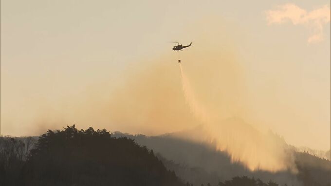 23日は自衛隊や県のヘリコプターによる空中からの放水が重点的に行われ、夜に比べて火の勢いは衰えたように見えましたが、鎮圧には至っていないということです。県によりますと、山林の消失は318ヘクタールで、22日午後6時現在から変わっていません。