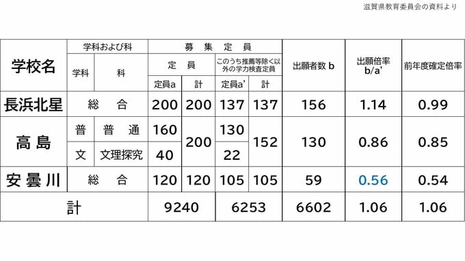 滋賀県教育委員会は、県内の公立高校の出願者数をまとめ、21日に発表しました。全体の出願状況からです。全日制は計9240人の定員のうち、推薦・特色選抜などを除いた計6253人が学力検査の定員で、ここに6602人が出願しました。全体の倍率は1.06倍となっていて、昨年度の確定出願倍率と同じ値となっています。
