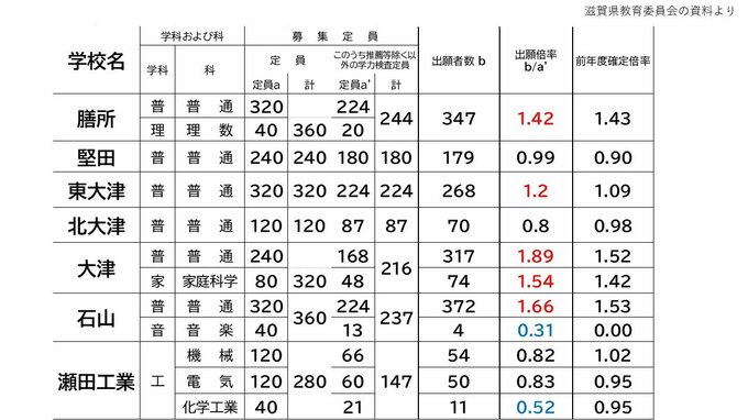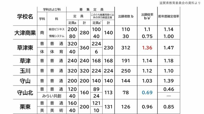 出願倍率の高い学校は、大津高の普通科で1.89倍、石山高の普通科で1.66倍、湖南農業の食品科で1.60倍などとなっています。