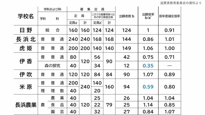 定員を下回っている学校は、石山高の音楽科で0.31倍、湖南農業高の花緑科で0.32倍などとなっています。