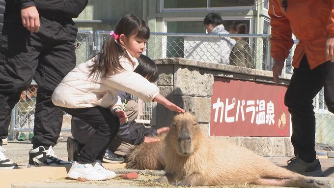 2月8日にリニューアルした「カピバラ温泉」が話題を呼んでいる別府ケーブルラクテンチ。6匹のカピバラを目当てに訪れる人もいるほど人気を集めています。24日は日差しをたっぷり浴びながら、のんびりと過ごすカピバラの姿が見られました。訪れた多くの人は、触ったり写真を撮ったりして癒されていました。