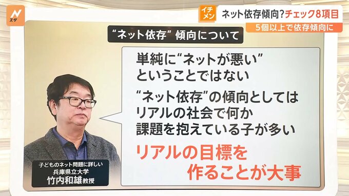 子どものネット問題に詳しい兵庫県立大学の竹内和雄教授は「単純に“ネットが悪い”ということではない。“ネット依存”の傾向としては、リアルの社会で何か課題を抱えている子が多い。リアルの目標を作ることが大事」だと指摘します。ネット社会に逃げ込まないように、リアルでの人間関係や環境をしっかりしていくことが重要だということです。