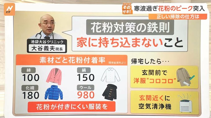 花粉の対策について、池袋大谷クリニックの大谷義夫院長は「花粉対策の鉄則は家に持ち込まないこと」としています。