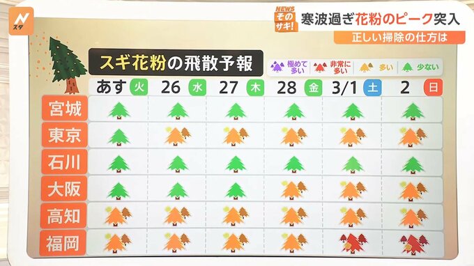 スギ花粉の飛散予想をみると、25日以降、東京などでは「多い」になってきています。