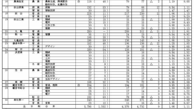 【香川県公立高校入試 2025】「一般選抜(志願変更・第二次発表)」倍率 高松南(生活デザイン)1.71倍 高松商業(英語実務)1.50倍 高松1.10倍【全校・全学科掲載・2025年2月25日発表】 RSK山陽放送 2025年2月25日(火) 17:44 国内 琴平・多度津・笠田・高瀬・観音寺第一・観音寺総合・高松第一 高松第一(音楽)では1.45倍、多度津(海洋水産)では1.44倍と高い倍率となっています。 そのほかの高校・学科は【画像③】の通りです。 【画像③】