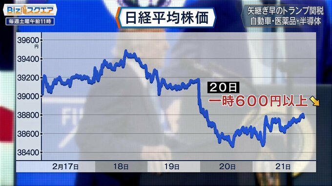こうしたトランプ大統領の相次ぐ関税政策の発表で、2月20日の東京株式市場は自動車など、輸出関連株が売られ、日経平均株価は一時600円以上値下がりした。