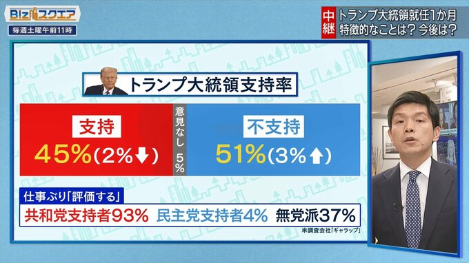 最初の1か月間は、大統領選勝利に導いた岩盤支持層に報いるということに力を入れていた。不法移民の対策や多様性に配慮していた政府の方針の見直しなど、保守的な選挙公約をどんどん実行に移している。また政策を矢継ぎ早に打ち出すことで自身への反対派、あるいはメディアがじっくり検証や反論ができないという狙いがあるとも言われている。実際、民主党はこの間、存在感を失ってしまっている。ただこうした政権発足後の動きは、無党派層など幅広い国民へのアピールには繋がっていない。世論調査での支持率は政権発足直後からわずかながら低下している。2年後には中間選挙が控えるという状況。徐々にもう少しウイングを広げるために「チップや残業代は免税」といった幅広い層に恩恵が及ぶような政策に徐々にシフトしていくものとみられる。