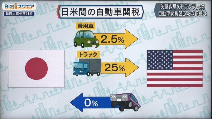 4月1日に国別の報告書が出る。ここで整理してくるのではないかとされる中で、一番気になるのが、自動車。現在アメリカは日本から輸入する乗用車には2.5%、トラックには25%の関税を課している。一方で日本側の関税率は0%。乗用車の2.5%を25%にすると言っているので、発動されると日本への影響は大きい。