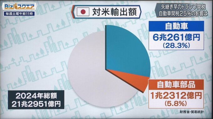 対米輸出額を見てみると、自動車は部品も含めると34%を占めており、まさに基幹産業だ。自動車関連だけで対米輸出の3分の1を占めている。メキシコやカナダ経由でアメリカに入っているものもある。