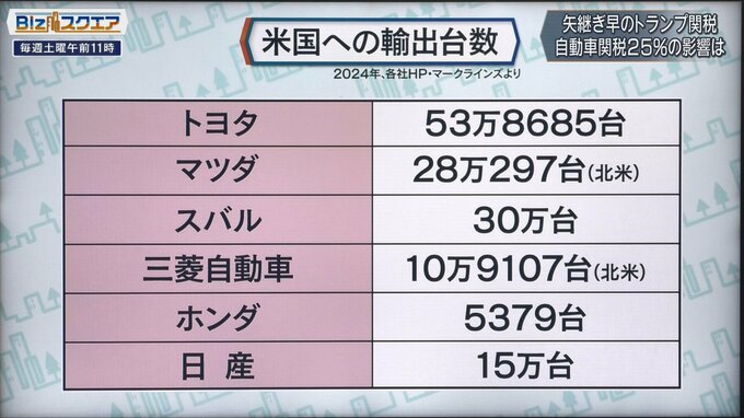 日本の自動車メーカーのアメリカへの輸出台数を見てみると、トヨタ自動車は53万台超。マツダは28万台、スバルは30万台、三菱自動車が10万台などとなっている。