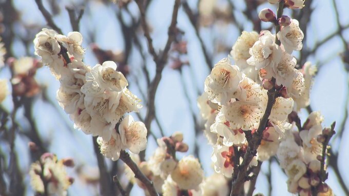 きのうまでの寒さから一転、25日のきょうは日差しにほっとできる1日となりました。甲府市では早咲きのウメが見頃を迎えていますが、ここ20年で開花が最も遅いということです。西垣友香キャスター:「ご覧ください…