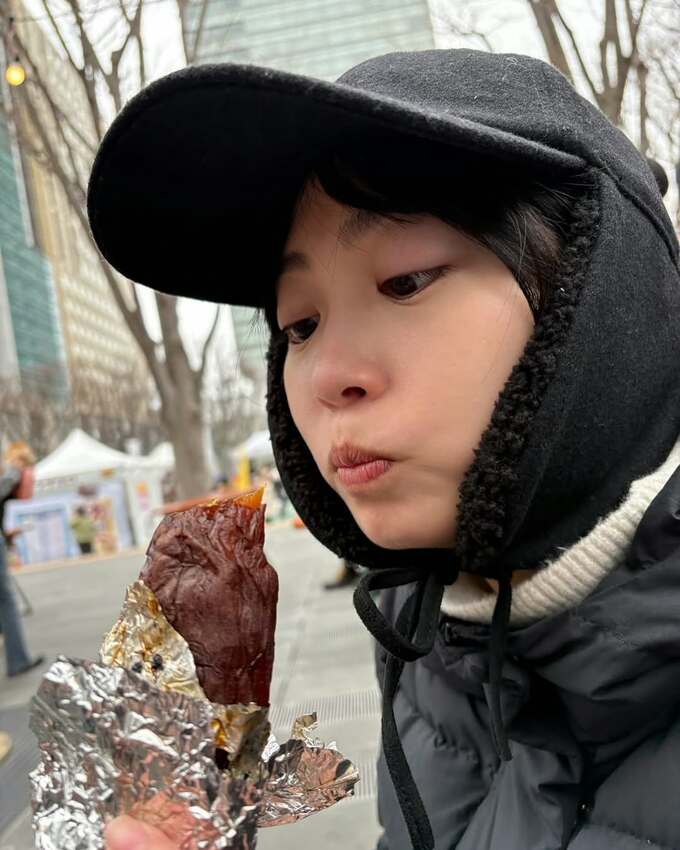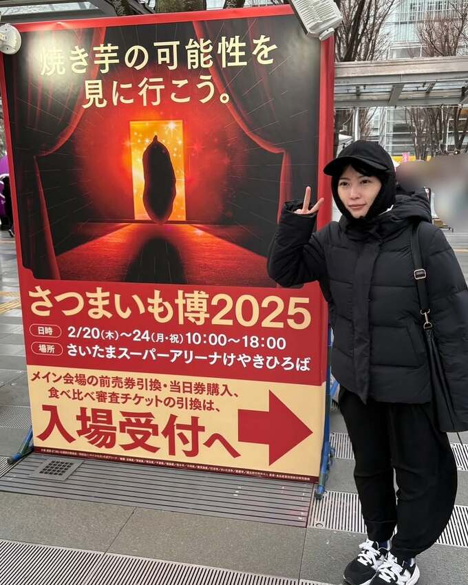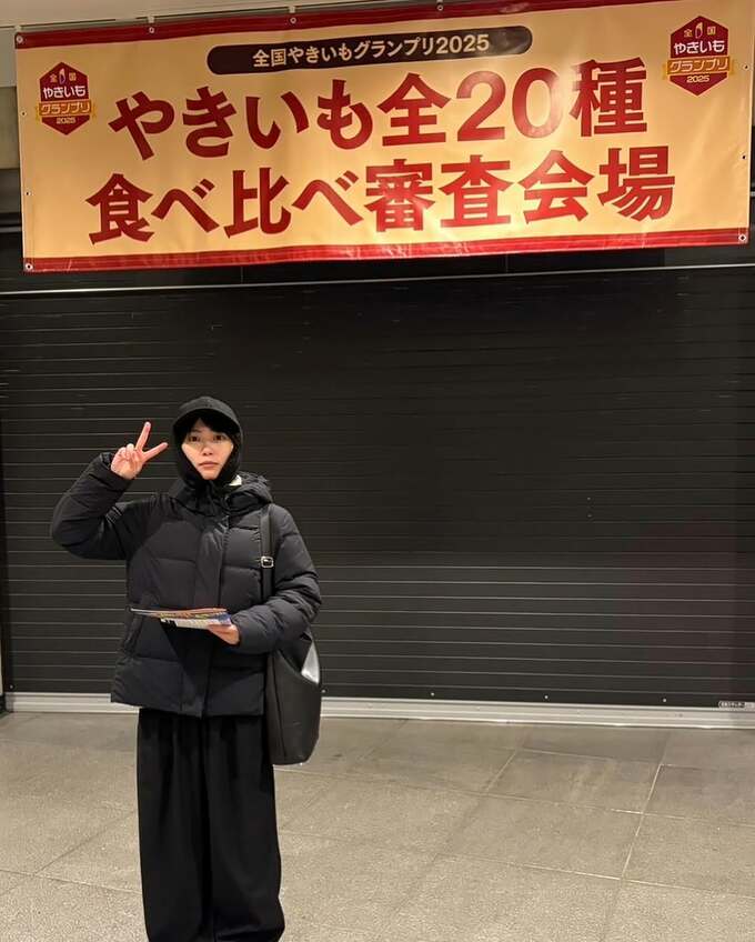 志田さんは「焼き芋の可能性を見に行ってきた。」と、焼き芋の絵文字とともに、一言だけテキストを投稿。写真では、先日「寒いよね」と俳句を詠んだ際に着込んでいた黒のダウンコートと黒の耳当てキャップを着込んだ完全防寒の志田さんが、「さつまいも博2025」というイベント会場の看板のそばでピースサインしています。