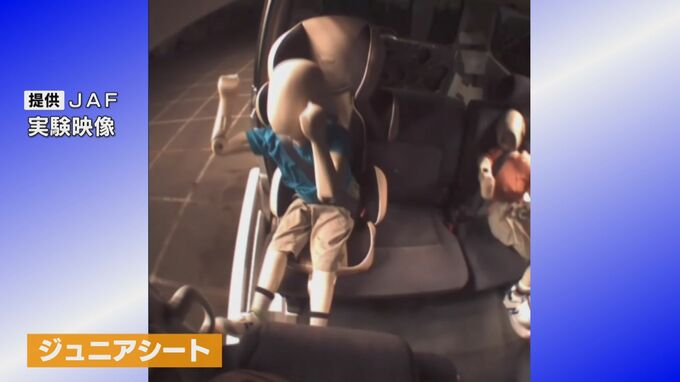 6歳児に見立てた人形でおこなったJAFの実験映像があります。ジュニアシートを着用している場合は、ベルトが鎖骨や骨盤にかかり衝撃を受け止めているのが分かります。一方で、シートベルトだと首やお腹が強く圧迫されてしまう場合があるのです。