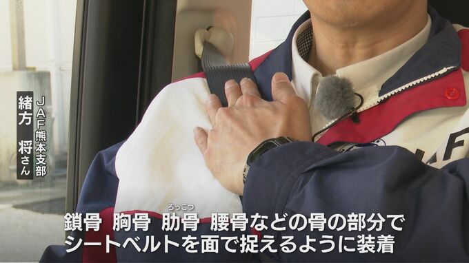 緒方さん「体の硬い部分にシートベルトをあてていくということが重要です。鎖骨、胸骨、肋骨、腰骨などの骨の部分でシートベルトを面で捉えるように装着して下さい」