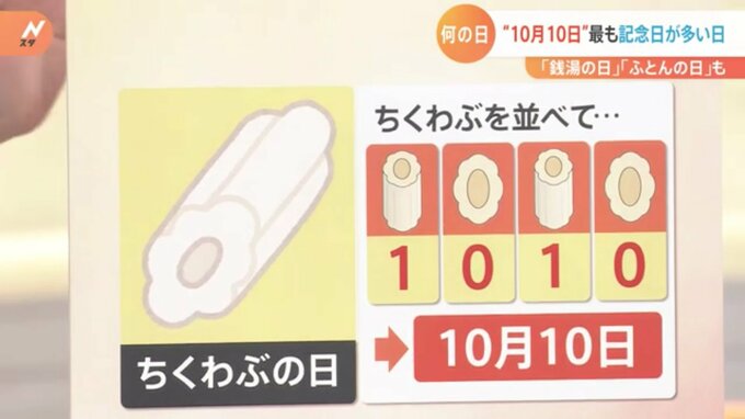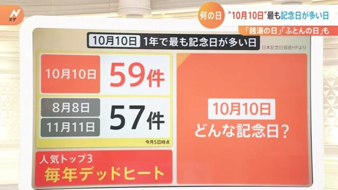 10月10日は(10日の)現時点で59件もの記念日が制定されていて1年で最も記念日が多い日なんです。今年の8月8日の番組内で記念日が最も多い日ですとお伝えしたばかりですが、記録が更新され10月10日がトップになりました。